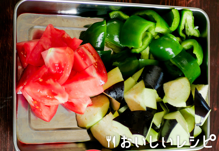 なすはピーラーで皮を数ヶ所縦にむき、乱切りにして水にさらします。ピーマンとトマトは一口大に切ります。