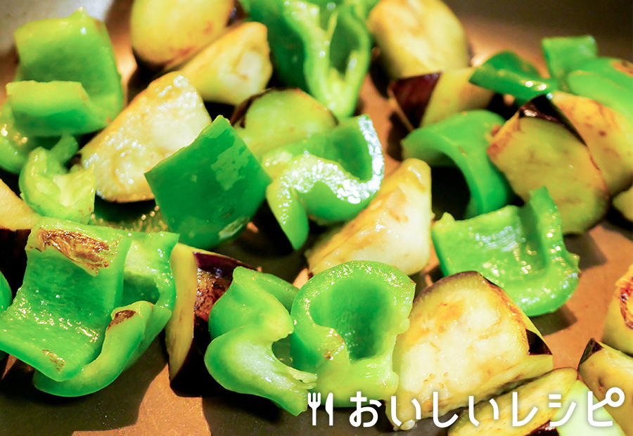 フライパンに油を熱し、なすとピーマンを炒めます。