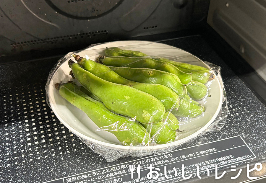 そら豆はさや付きのまま水洗いして耐熱皿にのせ、ふんわりとラップをかけて電子レンジ(500W)で約2分加熱します。